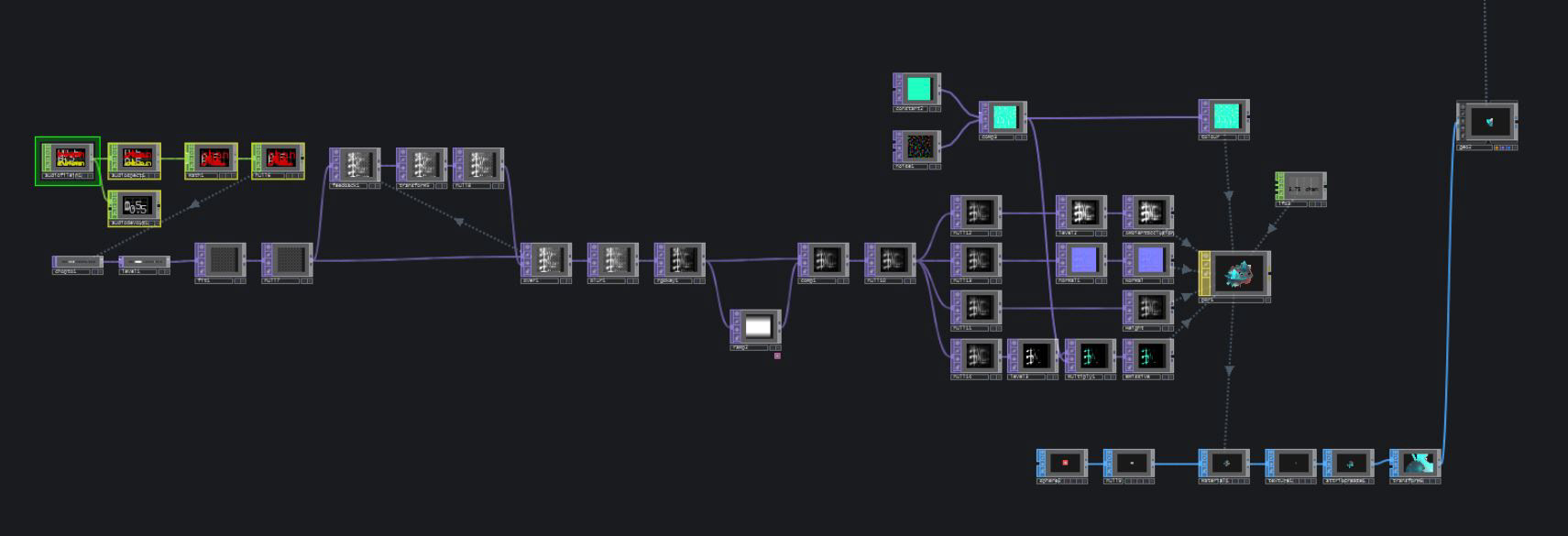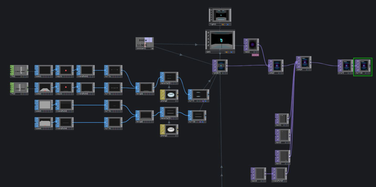 The audio reactive ball was created by adapting a Bileam Tschepe/Elekktronaut tutorial that creates an audio reactive PBR material using the audio spectrum CHOPs, and adapting the sound waves into the material parameters. I then applied this material to a sphere, and this created the flowering reactor core aesthetic, and set this geometry to be rendered along with the hexagonal plates.